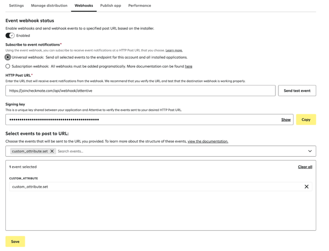 You will only see this key once, be sure to send it securely to a Checkmate member. - Click the Webhooks tab and