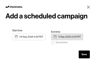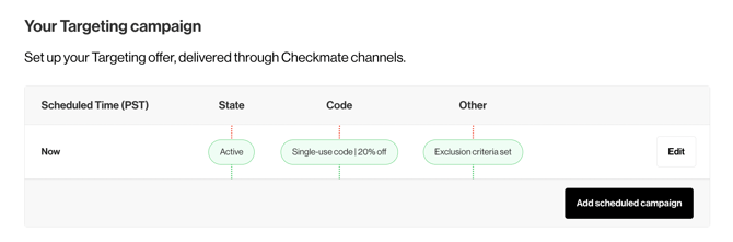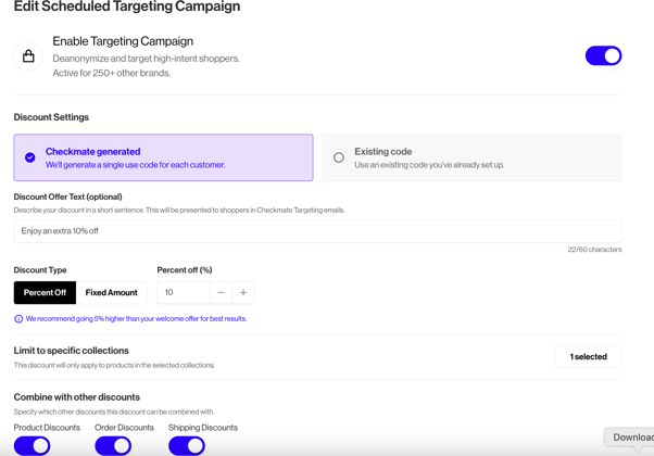 Check your Checkmate Targeting Dashboard to create or edit scheduled campaigns. Set start and end times to run promotions exactly when you want. For sitewide sales, select the Existing Code option and customize the discount text shown to shoppers. Choose between a percentage or fixed dollar discount, limit it to specific collections, and control whether it can be combined with other offers—giving you complete flexibility over your campaigns.